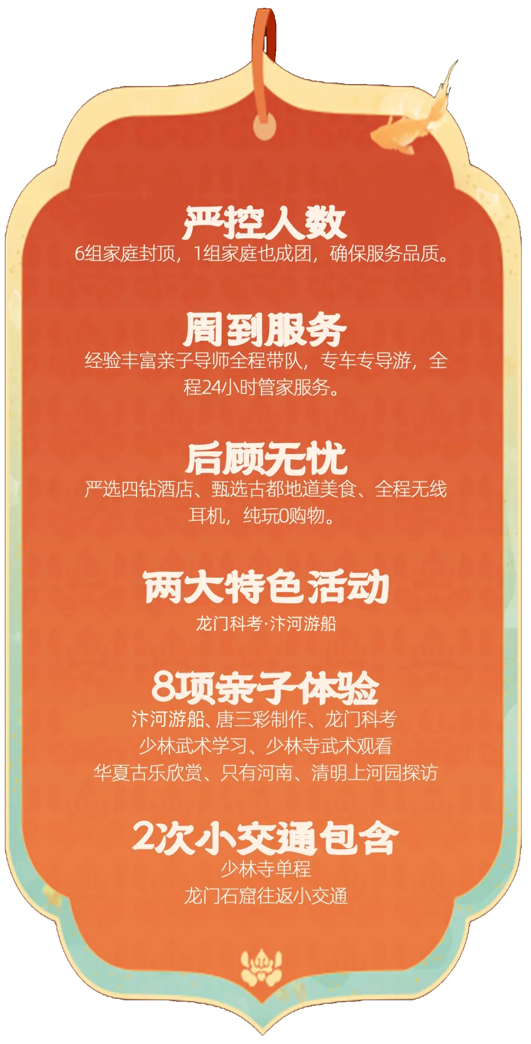 以亲子古都穿越为主题依次穿越洛阳、开封、郑州三大古都,安排8项亲子互动体验,二场夜色特别活动,一次主题乐园,从白天到黑夜,沉浸体验不一样的色彩。